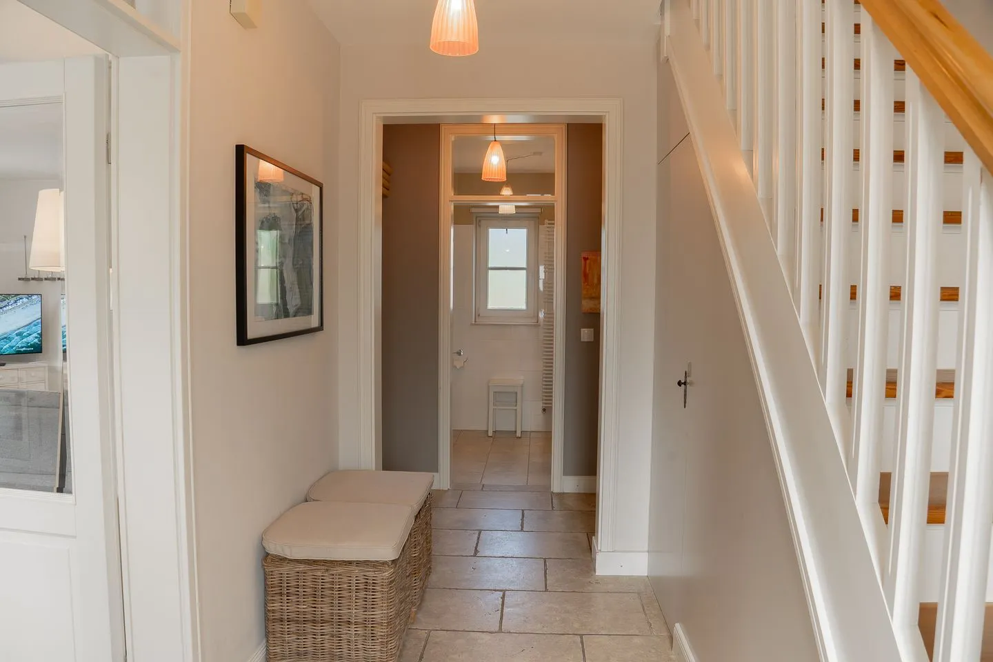 Für Ihre Ruhe und Entspannung sorgen drei moderne Badezimmer. Eines davon mit einer bodengleichen Dusche, das andere mit einem Whirlpool, die Ihnen nach einem langen Strandtag Erholung bietet. Zusätzliche Annehmlichkeiten wie eine Waschmaschine, ein Trockner, Bügelutensilien sowie ein Staubsauger sind ebenfalls vorhanden, sodass Sie keine Kompromisse bei Ihrem Komfort eingehen müssen.