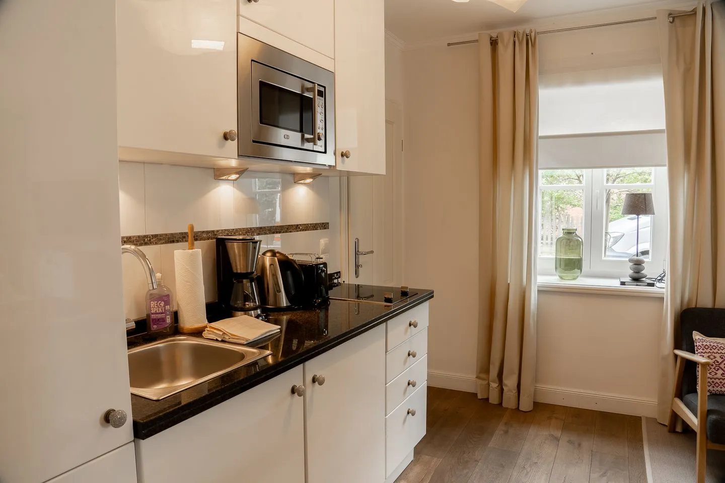 Die "Alte Wache Komplett" ist separat Buchbar - "Alte Wache Haus" & "Alte Wache Appartement" ergeben die "Alte Wache Komplett". Die Einliegerwohnung "Alte Wache Appartement" dient für 2 Personen und enthält eine eigene Küche, ein eigenes Duschbad sowie einen eigenen Zugang zu einer weiteren Terrasse mit Strandkorb.