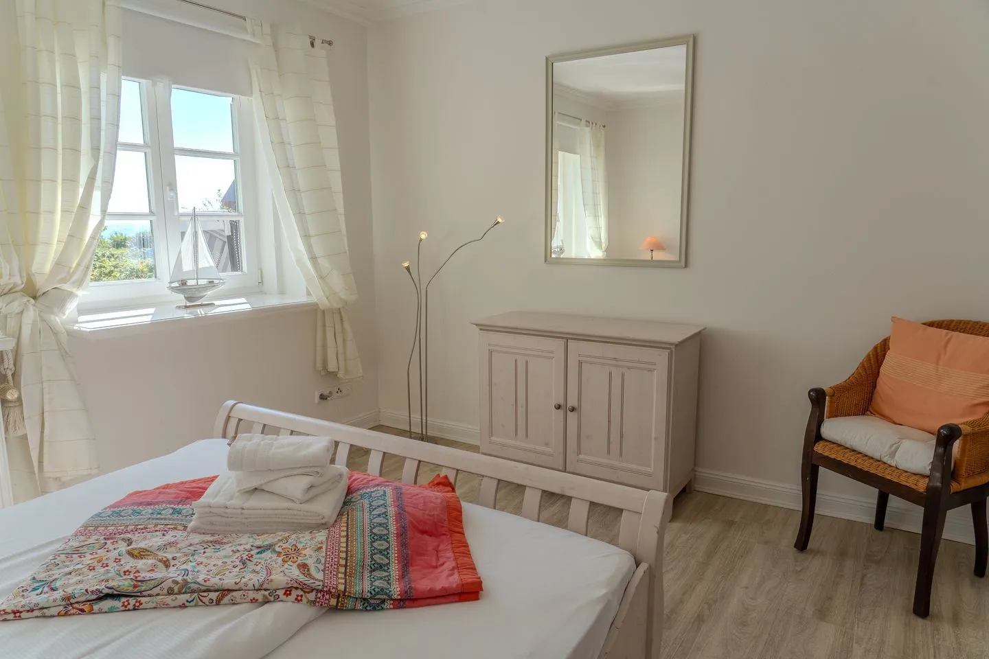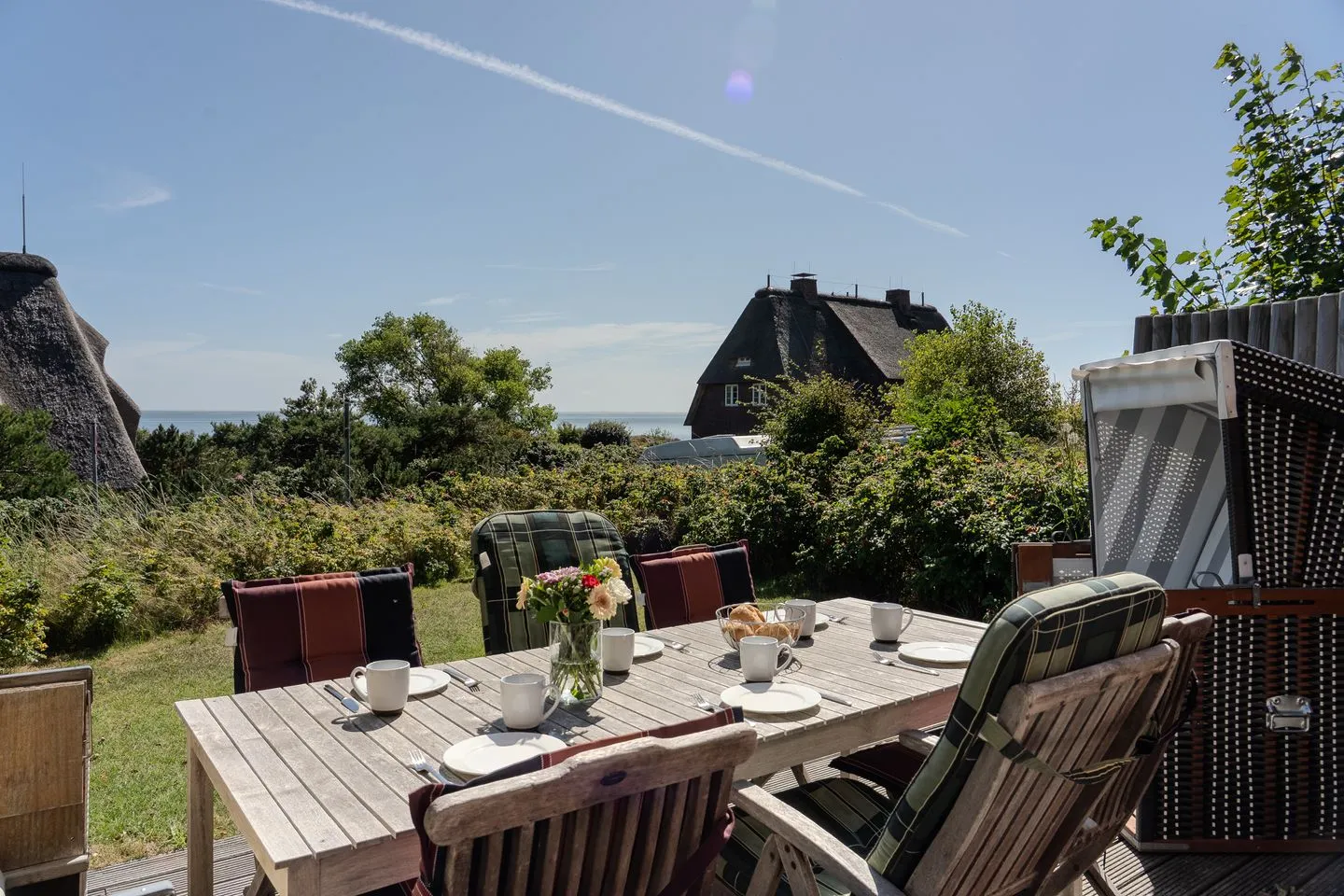 Die vier Schlafzimmer sowie der offen gestaltete Wohn- und Essbereich verteilen sich auf drei Etagen. Der freundliche Laminatboden in den Schlaf- und Wohnzimmern sorgt für eine wohnliche Atmosphäre, während große Fenster ganztägig Licht in die Räume lassen und einen guten Meerblick ermöglichen. Das Wohnzimmer verfügt über eine gemütliche Sofaecke mit TV (Satellitenempfang) und eine Essgruppe, die zu gemeinsamen Mahlzeiten einlädt. Ein weiteres Highlight stellt der direkte Zugang zur Terrasse dar, die mit Gartenmöbeln sowie zwei Strandkörben ausgestattet ist und einen entspannten Aufenthalt im Freien verspricht. Der Garten bietet zusätzlichen Raum für Erholung oder zum Spielen für Kinder.