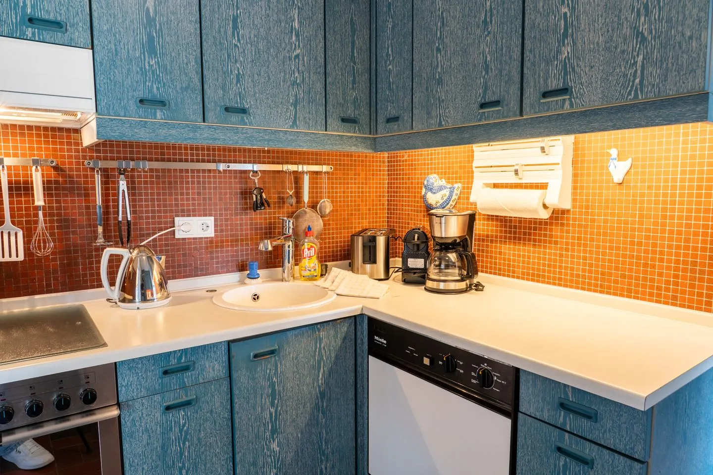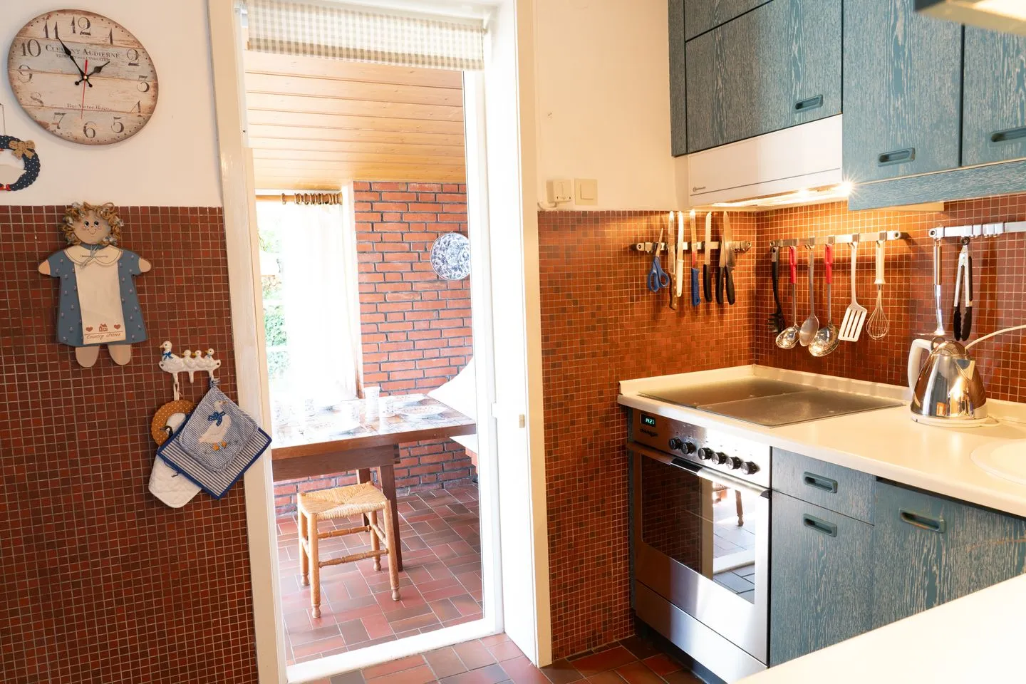 In der geschlossenen Küche finden Sie hochwertige Geräte wie einen Ceranherd, Backofen (Elektroanschluss), Kühlschrank mit Gefrierfach, Spülmaschine, Toaster, Kaffeemaschine, Espressomaschine DeLonghi, Wasserkocher, Mixer und umfangreiche Küchenutensilien – so lassen sich problemlos Mahlzeiten für die ganze Familie oder eine größere Gruppe zubereiten. Der angrenzende Essbereich ist mit Esstisch und ausreichend Platz für gemeinsame Runden ausgestattet.