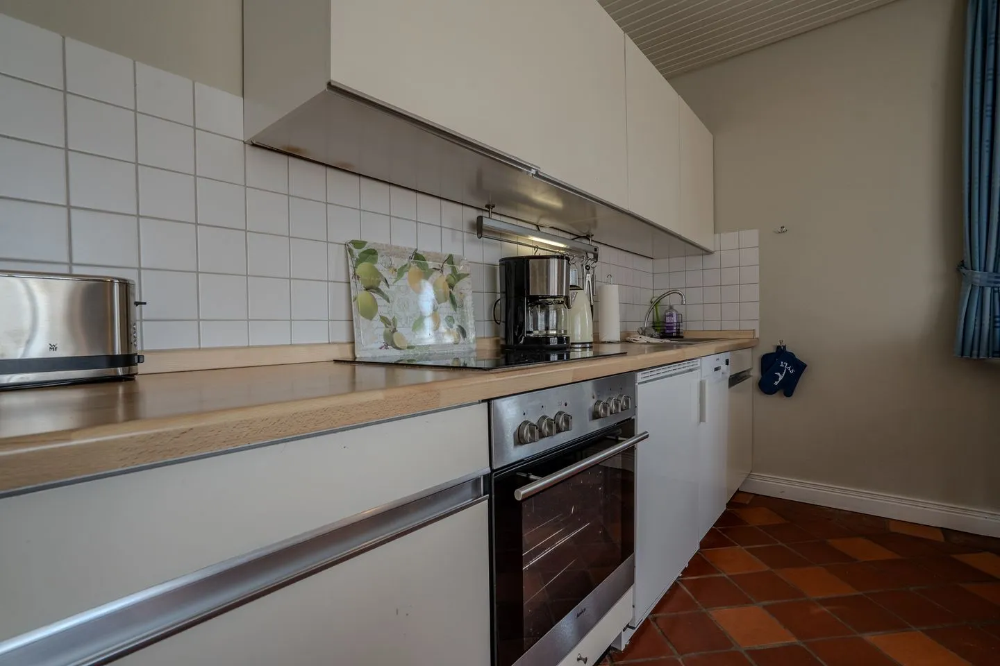 Der großzügige Wohnbereich ist durch eine offene Küche mit Esstisch verbunden und bietet ein Sofa, Sessel sowie einen Fernseher (25–34 Zoll, Satellitenanschluss), Radio und kostenloses WLAN. Für Lektürefreunde steht eine kleine Büchersammlung zur Verfügung. Die Küche ist voll ausgestattet mit Ceranherd, Elektrobackofen, Kühlschrank samt Gefrierfach, Spülmaschine, Kaffeemaschine, Wasserkocher, Toaster, Mixer sowie sämtlichen nötigen Küchenutensilien, Geschirr und Besteck.