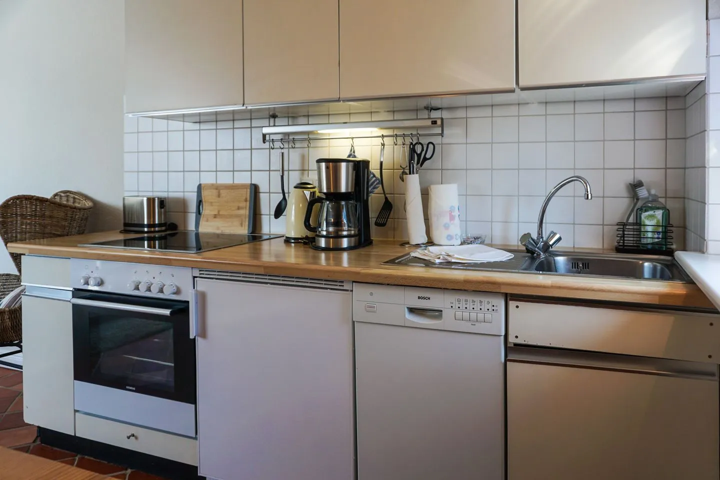 Die offene Küche grenzt direkt an das Wohnzimmer und ist umfassend ausgestattet: Ihnen stehen ein Induktionsherd, Backofen mit Elektroanschluss, Kühlschrank mit integriertem Gefrierfach, Spülmaschine, Kaffeemaschine, Toaster, Wasserkocher, Küchenmaschine, Mixer und eine vollständige Auswahl an Geschirr sowie Küchenutensilien zur Verfügung. Im Essbereich mit Esstisch können Sie Ihre Mahlzeiten in angenehmer Atmosphäre genießen.
