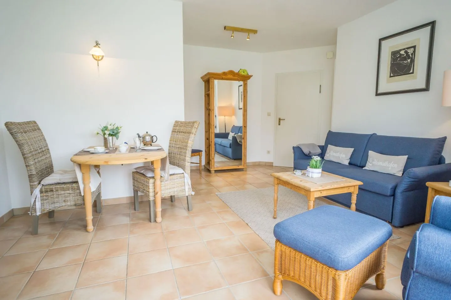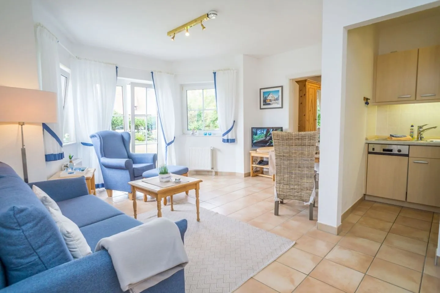 Das helle Wohnzimmer ist mit Fliesenboden ausgestattet und bietet eine gemütliche Sofaecke mit zusätzlichem Sessel, Esstisch sowie Satelliten-TV (25–34 Zoll). Hier können Sie entspannen, lesen oder sich bei einem Filmabend erholen. Für Unterhaltung sorgen auch bereitgestellte Bücher. Die moderne Heizung sorgt zu jeder Jahreszeit für angenehme Temperaturen. Große Fenster lassen viel Tageslicht herein und geben Ihnen einen schönen Blick in den privaten Garten.