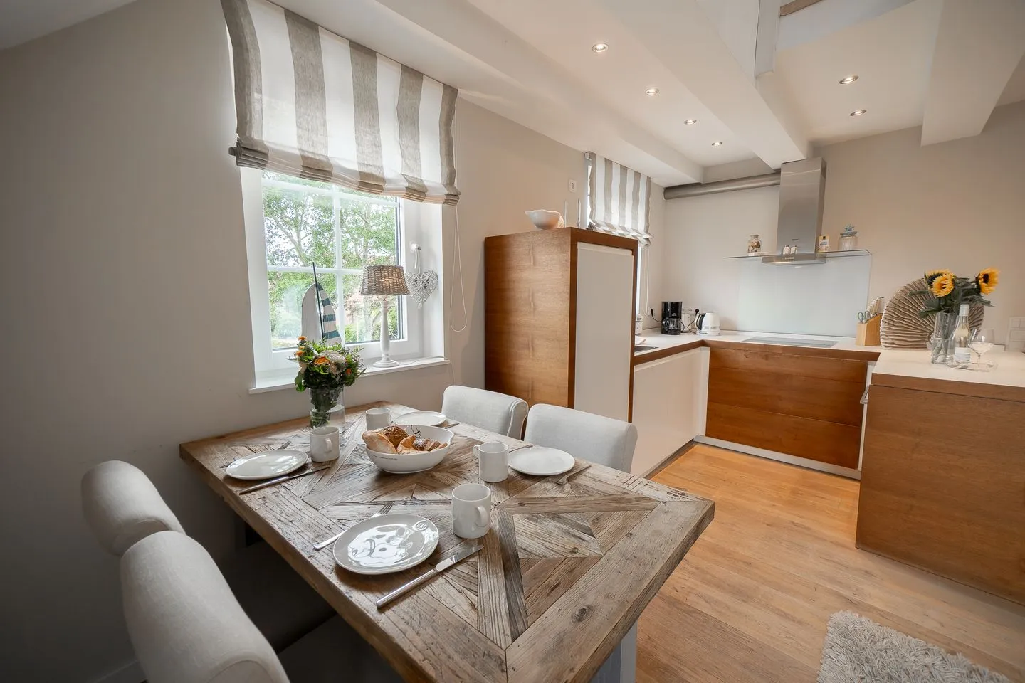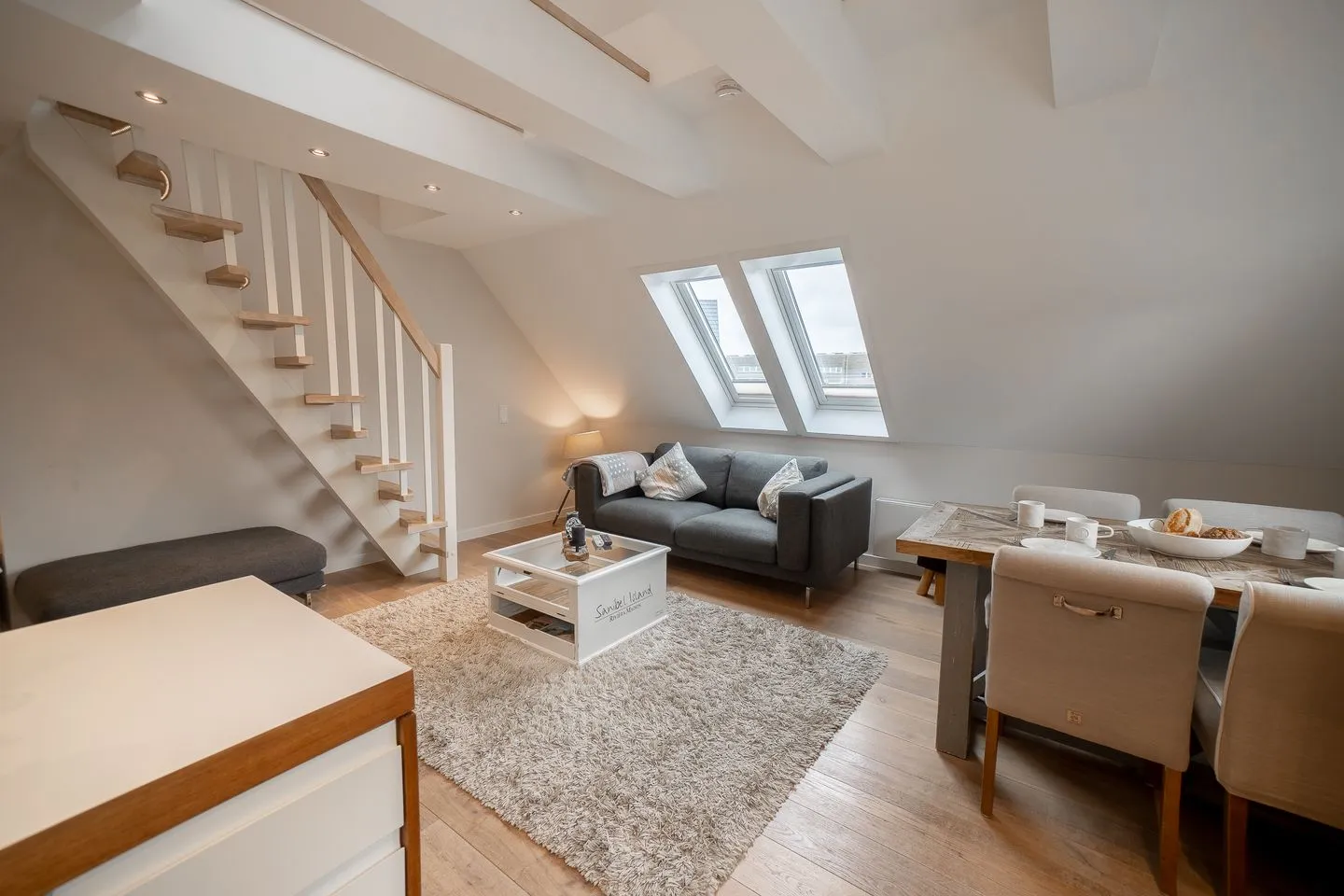 Die Wohnung verfügt über zwei separate Schlafzimmer mit einem pflegeleichten Laminatboden, die insgesamt Platz für vier Personen bieten. Auch im Wohnbereich wurde Wert auf einen sauberen Laminatboden gelegt. Das Appartement verteilt sich auf zwei Etagen, wobei sich die gesamte Wohnfläche im ersten Stock befindet. Der offene Wohn-Essbereich ist modern und funktional gestaltet und bietet ein großzügiges Sofa, einen Esstisch sowie eine Garderobe.