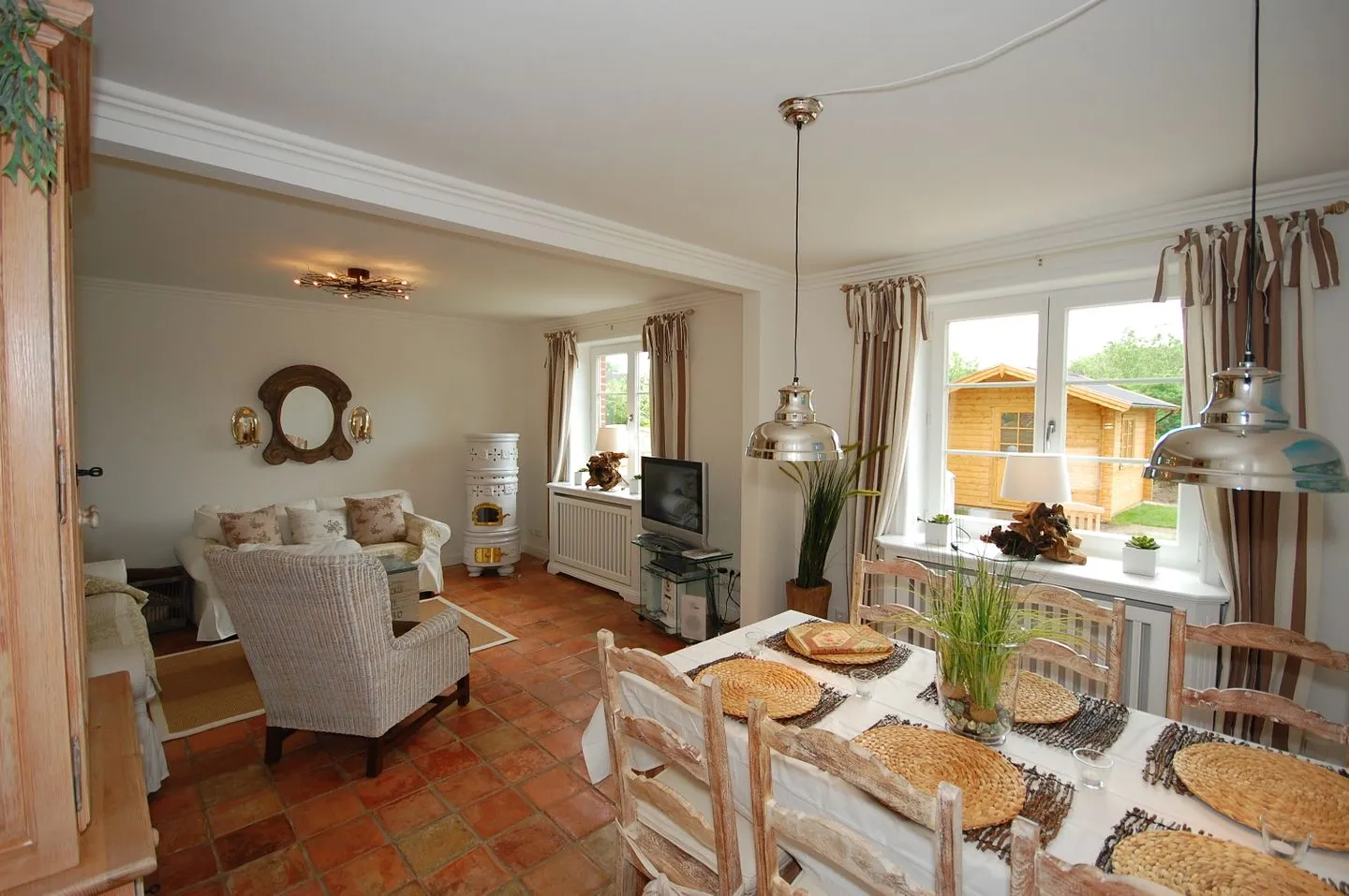 Großzügige Fenster eröffnen Ihnen einen freundlichen Gartenblick. Im Außenbereich laden eine möblierte Terrasse, ein Garten mit Liegewiese sowie zwei eigene Strandkörbe zum Entspannen ein. Für Fahrzeuge steht ein Privatparkplatz bereit. Das Domizil ist besonders familienfreundlich und begrüßt auch Haustiere.