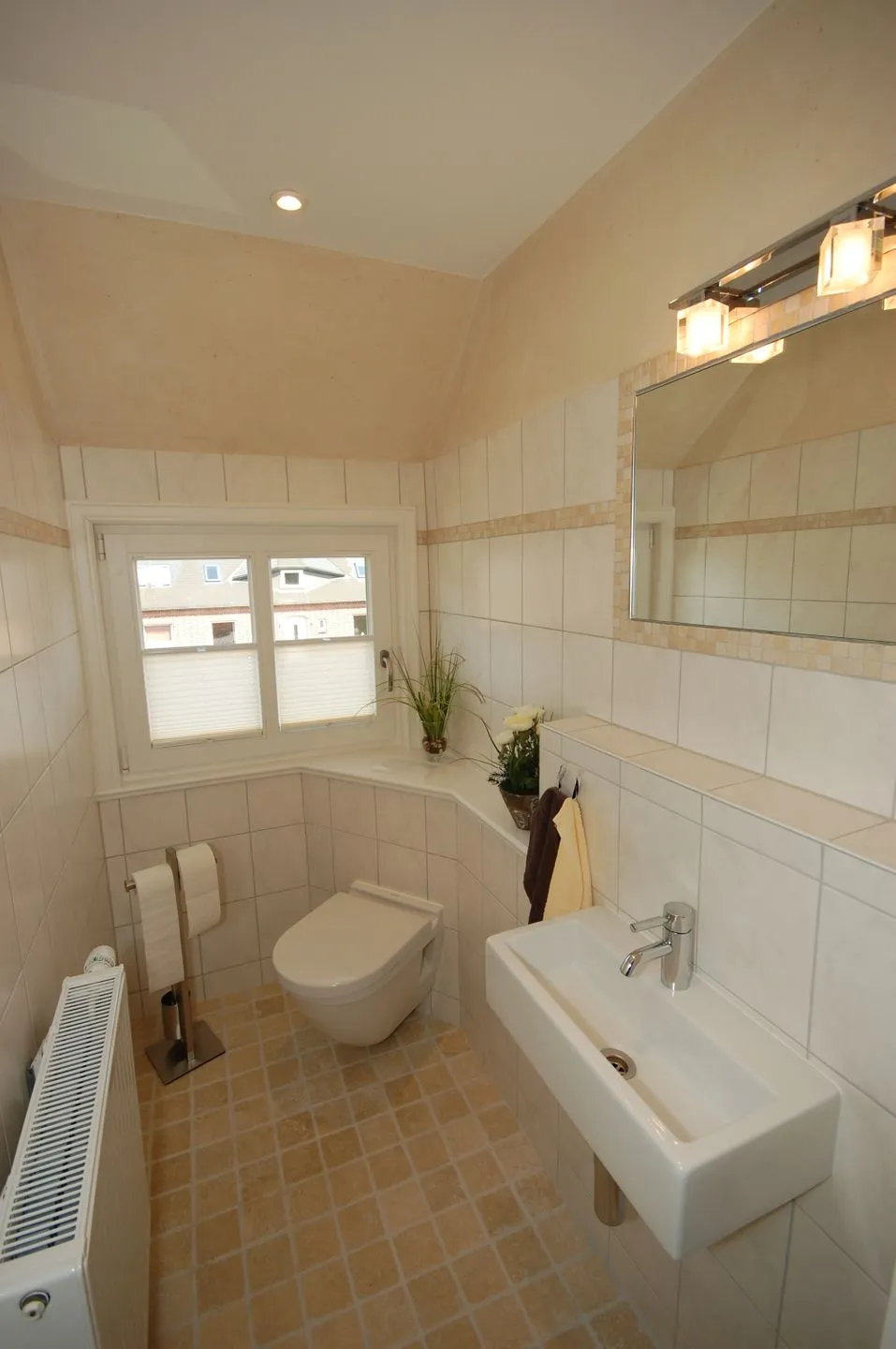 Das Interieur ist stilvoll mit Fliesenboden im Wohnzimmer, einer Sofaecke, Sesseln sowie einem Essbereich gestaltet. Ein Ganzkörperspiegel, Kosmetikspiegel, Haartrockner und ein modernes, bodengleiches Duschbad sowie eine Badewanne und Fenster in beiden Badezimmern runden das Angebot ab.