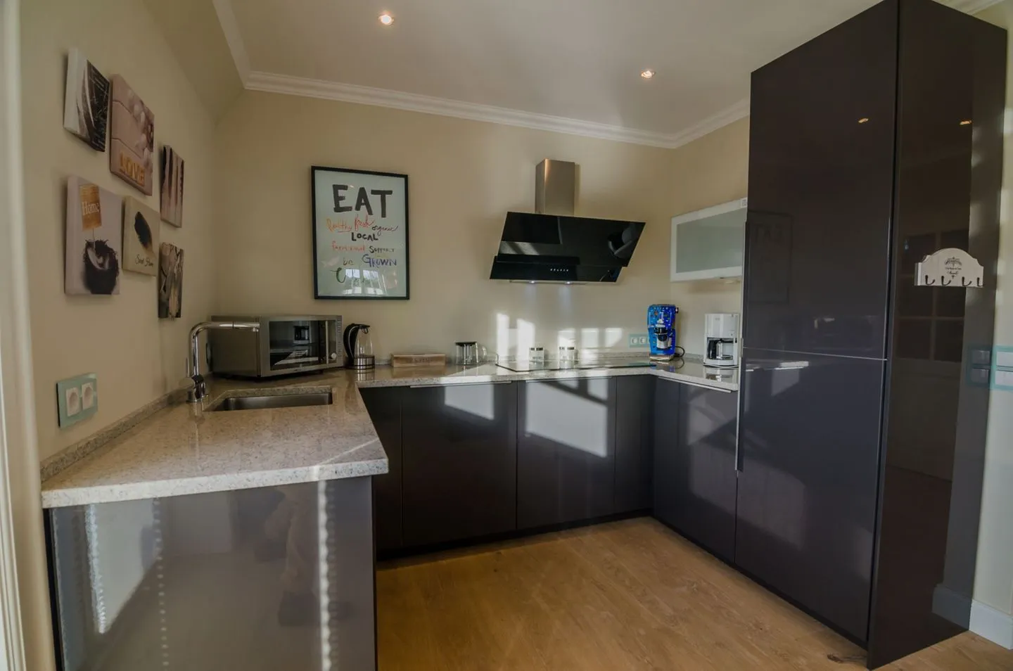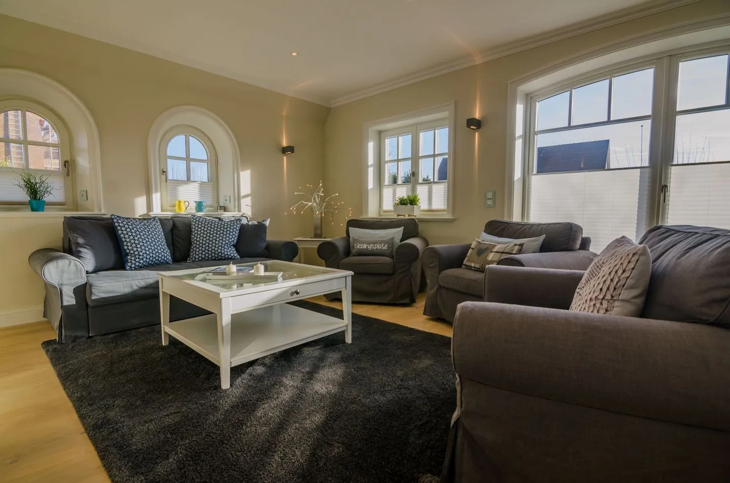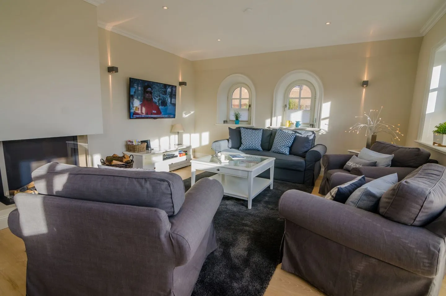 Der lichtdurchflutete Wohnbereich verfügt über einen gemütlichen Essbereich, eine Sofaecke sowie Fernseher und WLAN-Anbindung. Ihr Komfort steht im Mittelpunkt: Eine offene, moderne Küche, die in den Wohnraum integriert ist, lässt mit Cerankochfeld, Elektrobackofen, Geschirrspüler, Kühlschrank mit integriertem Gefrierfach, Espressomaschine (Cafissimo), Kaffeemaschine, Toaster, Wasserkocher, Mikrowelle und vollständigen Küchenutensilien keine Wünsche offen. Am Esstisch findet die ganze Familie bequem Platz.