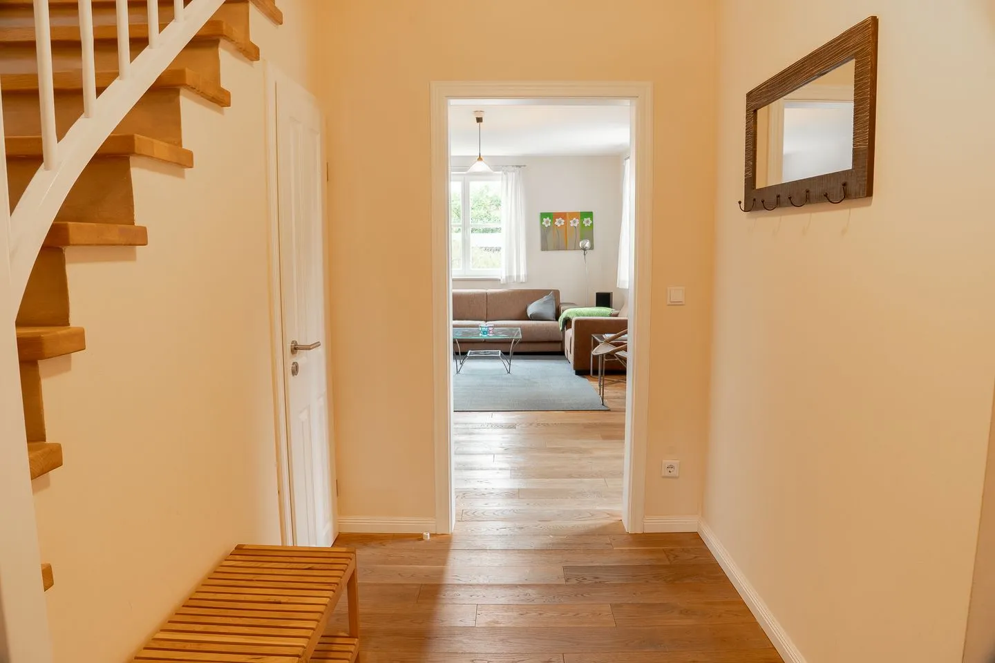 Das Wohn- und Esszimmer des Ferienhauses besticht durch einen hellen Laminatboden und eine gemütliche Sofaecke. Ein Fernseher mit einer Bildschirmgröße von 31 Zoll sowie Sat-Anschluss sorgt für Unterhaltung. Weiterhin sind ein CD-Spieler, ein Radio und eine Auswahl an Büchern sowie Gesellschaftsspielen vorhanden, die für abwechslungsreiche Freizeitgestaltung an Regentagen sorgen. Der Essbereich mit einem Esstisch lädt zu gemeinsamen Mahlzeiten ein.
