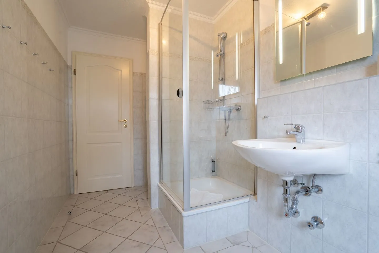 Das Badezimmer verfügt über eine Dusche, ein WC, Waschbecken und Spiegel, zudem sorgt ein Fenster für Tageslicht und Frischluft. Ein Haartrockner ist ebenfalls vorhanden. Für zusätzlichen Komfort stehen Ihnen gemeinschaftlich eine Waschmaschine, ein Trockner, Bügelbrett sowie Bügeleisen und ein Wäscheständer zur Verfügung, sodass sich auch längere Aufenthalte unkompliziert gestalten lassen. Auch ein Staubsauger ist im Hausflur zur gemeinschaftlichen Nutzung vorhanden.