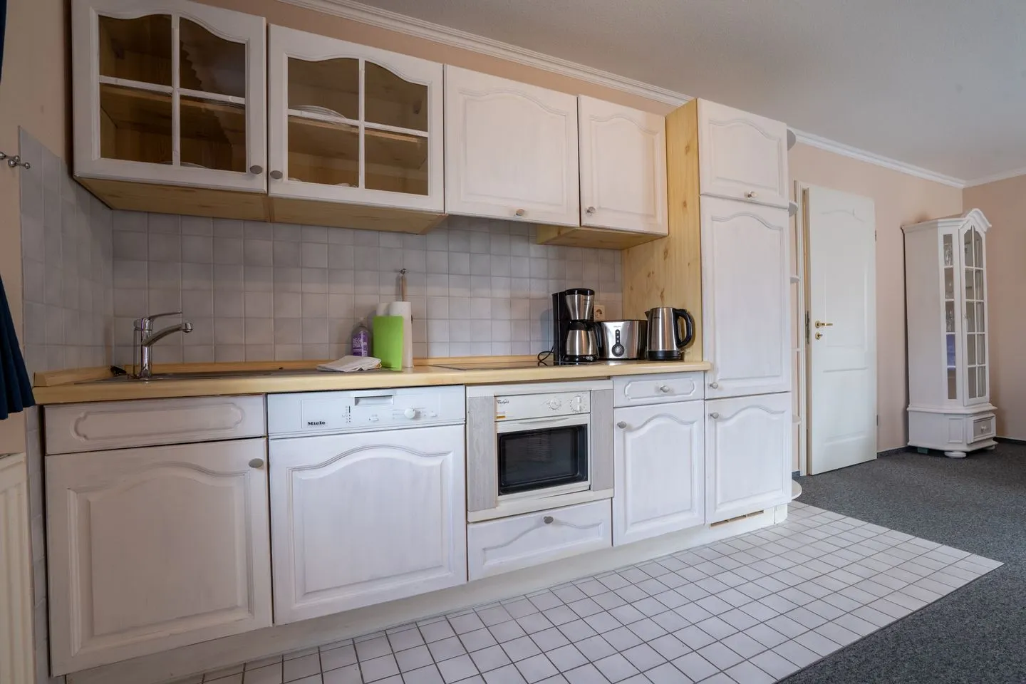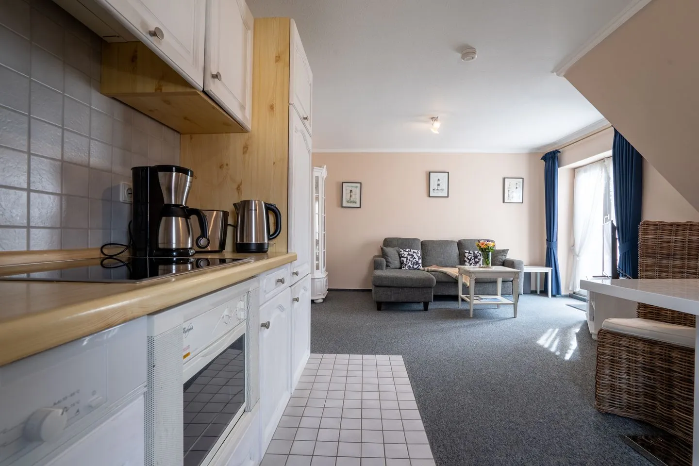 Das Schlafzimmer ist mit zwei Schlafmöglichkeiten versehen und bietet ausreichend Stauraum, etwa durch eine Kommode. Die offene, zum Wohnzimmer hin angelegte Küche ist vollständig ausgestattet: Neben Ceran-Kochfeld, Backofen, Mikrowelle, Kühlschrank mit integriertem Gefrierfach, Spülmaschine, Wasserkocher, Toaster und Kaffeemaschine steht Ihnen sämtliches nötiges Geschirr und Küchenzubehör zur Verfügung – so können Sie sich auch während Ihres Urlaubs selbst versorgen. Ein eigener Balkon lädt an sonnigen Tagen zum Verweilen ein und ist mit Gartenmöbeln möbliert.