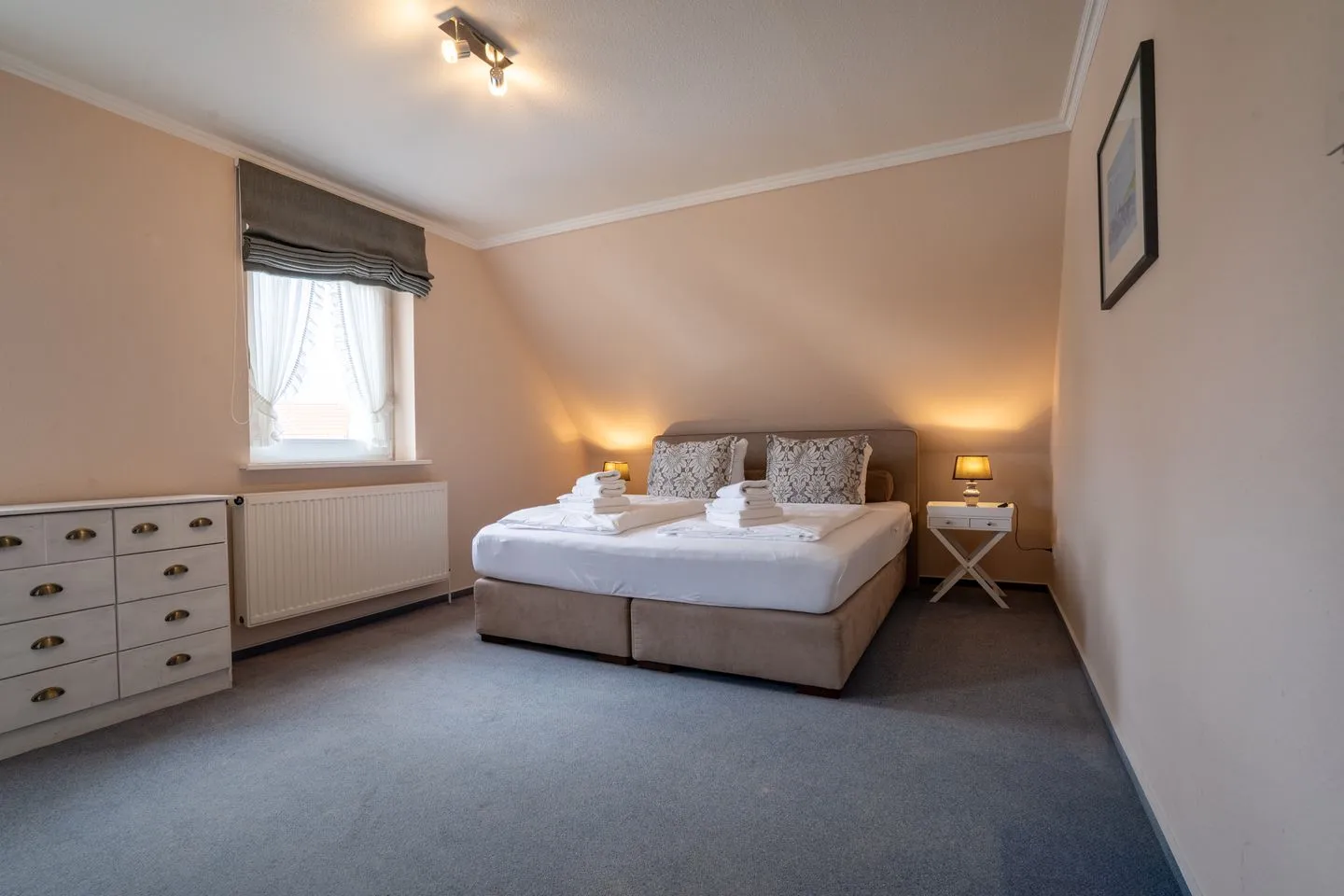 Die Unterkunft eignet sich ideal für Paare oder kleine Familien, die Wert auf Komfort und eine umfassende Ausstattung legen. Sie betreten die Wohnung über einen geräumigen Eingangsbereich mit Garderobe, von dem aus sich der offene Wohn- und Essbereich erschließt. Hier laden ein gemütliches Sofa und ein Essplatz zu entspannten Stunden ein. Der Boden im Wohnbereich ist ebenso wie im Schlafzimmer mit Teppich ausgelegt, was für eine angenehme, behagliche Atmosphäre sorgt.