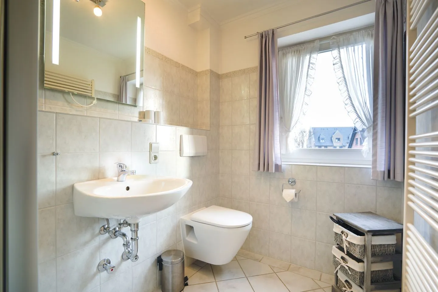 Im Badezimmer finden Sie eine moderne Dusche, WC, Waschbecken, Spiegel, Fenster, Haartrockner sowie einen Ganzkörperspiegel. Im Haus stehen eine gemeinschaftlich nutzbare Waschmaschine und ein Trockner zur Verfügung. Ein Bügelbrett, Bügeleisen, Staubsauger und Wäscheständer sind ebenso für alle Gäste gemeinschaftlich Nutzbar. Ein Privatparkplatz direkt an der Unterkunft ist für Sie reserviert.