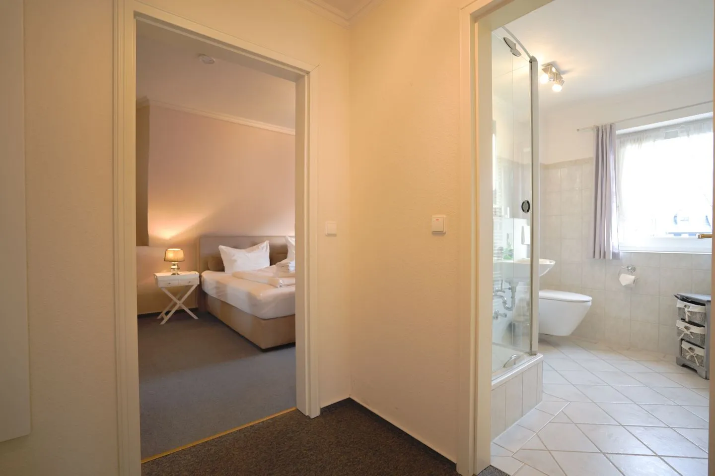 Das Schlafzimmer ist mit Teppichboden ausgelegt und verfügt über gemütliche Schlafmöglichkeiten für zwei Personen. Der Bodenbelag sorgt sowohl im Wohn- als auch im Schlafzimmer für eine behagliche Atmosphäre. Der Balkon ist mit Gartenmöbeln ausgestattet und lädt zu entspannten Momenten an frischer Nordseeluft ein.