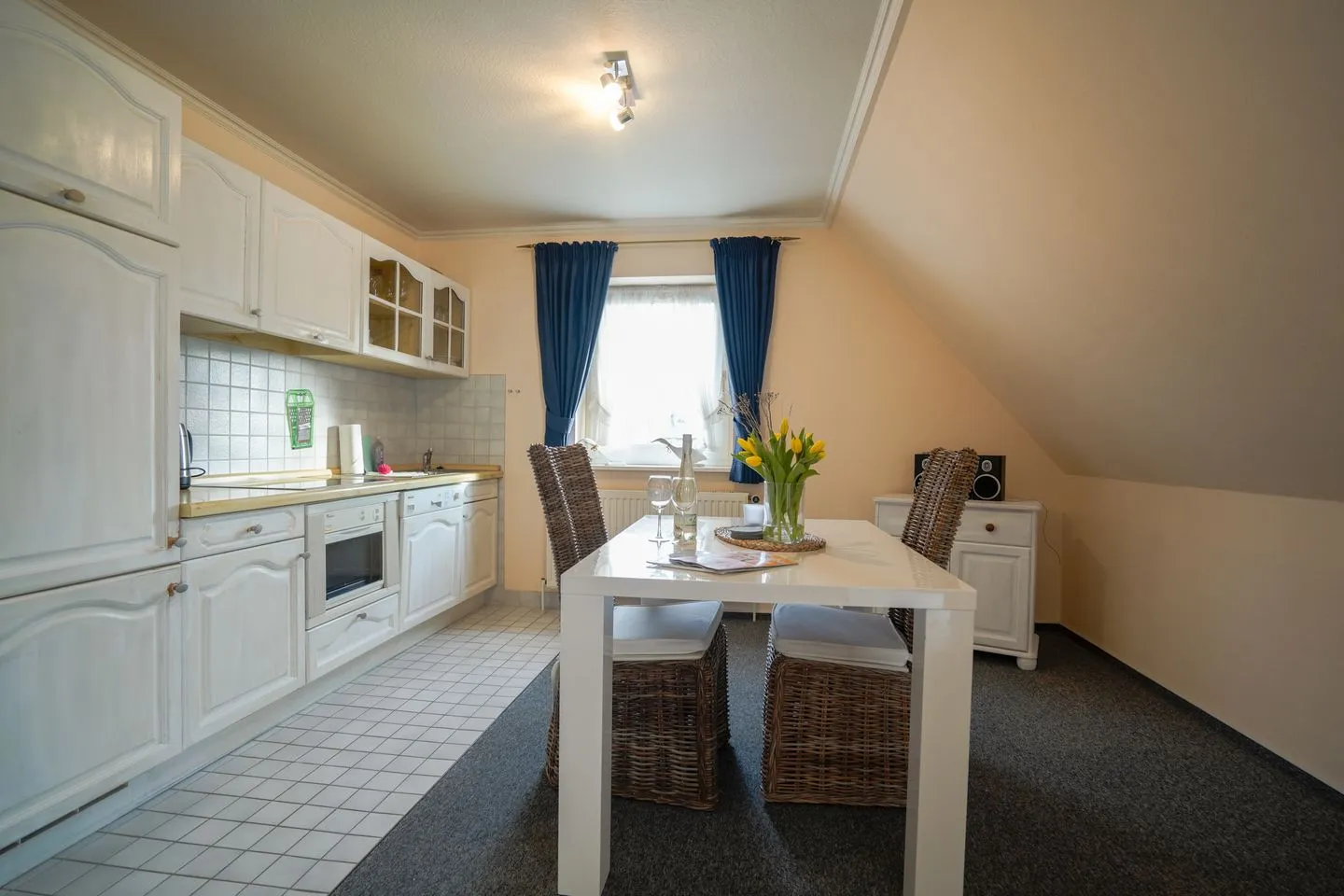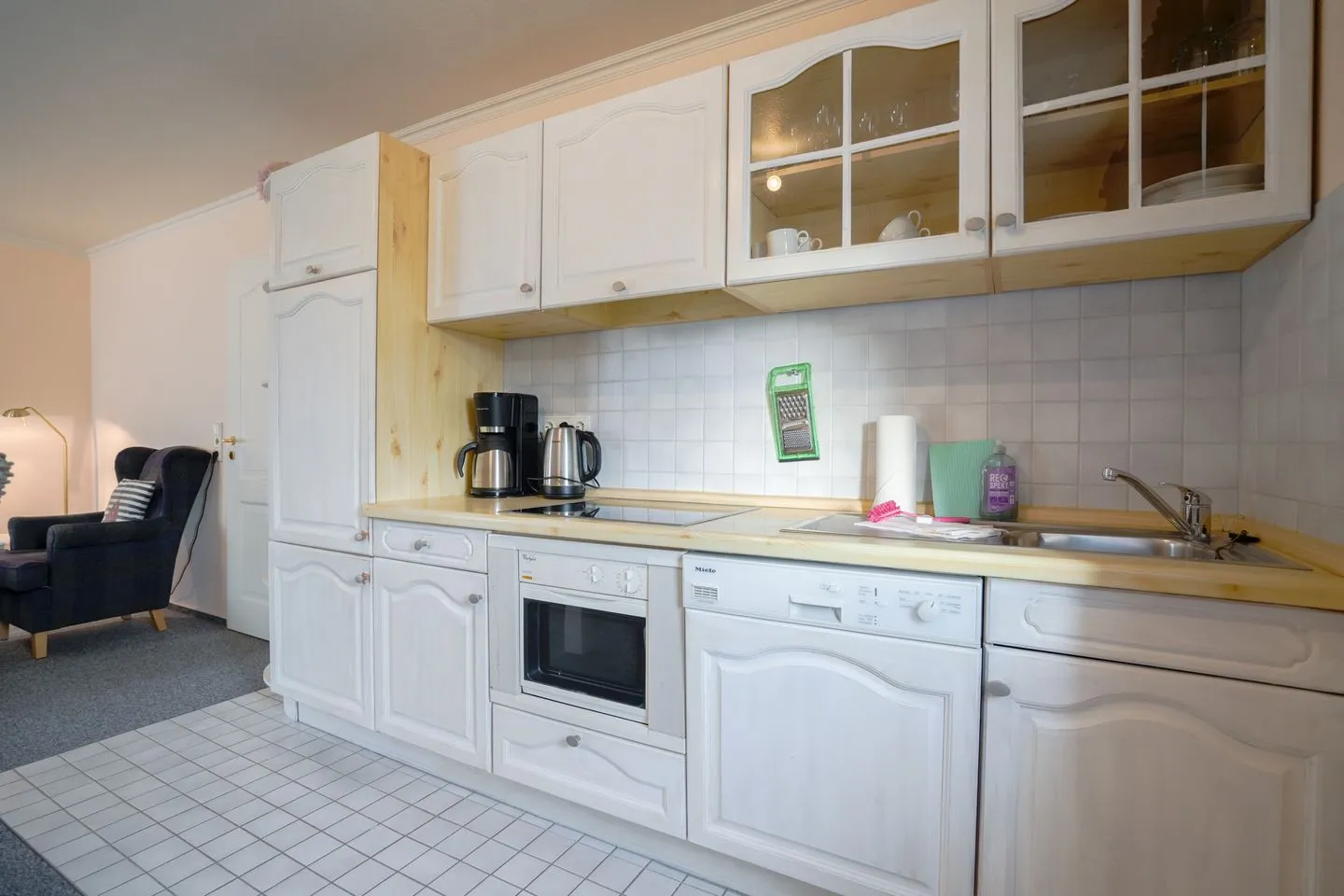 Die Ausstattung der Unterkunft ist sowohl funktional als auch komfortabel gestaltet. Im offen zum Wohnzimmer gestalteten Küchenbereich stehen Ihnen ein Induktionsherd, Kühlschrank mit Gefrierfach, Spülmaschine, Kaffeemaschine, Toaster, Wasserkocher und zahlreiche Küchenutensilien sowie Geschirr und Besteck zur Verfügung. Der Essbereich grenzt unmittelbar an die Küche an. Das Wohnzimmer weist eine Sofaecke, Sessel, Esstisch und einen modernen Fernseher (35–44 Zoll, Satellitenanschluss) auf. Weitere Unterhaltung bieten Bücher und Spiele.