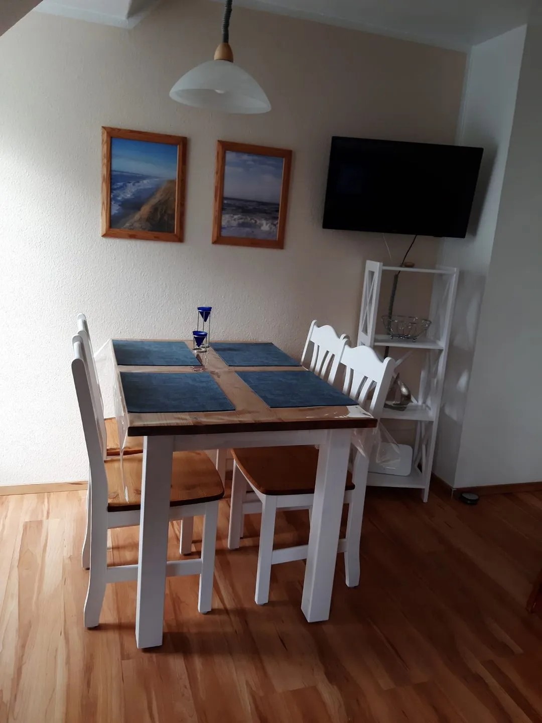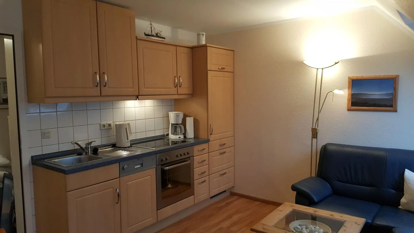 Die offene Küche ist in den Wohnbereich integriert und mit modernen Geräten ausgestattet: Ceranherd, Backofen, Spülmaschine, Kühlschrank mit integriertem Gefrierfach, Wasserkocher, Toaster, Kaffeemaschine sowie alle notwendigen Küchenutensilien und ausreichend Geschirr und Besteck. Der Esstisch lädt zum gemeinsamen Speisen ein. Die Nutzung einer eigenen Waschmaschine, Bügeleisen, Bügelbrett, Wäscheständer und Staubsauger erleichtert längere Aufenthalte und Familienaufenthalte. Für Ihre Sicherheit sind Rauchmelder installiert.
