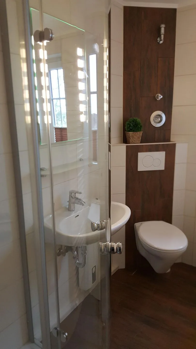 Das Badezimmer bietet eine bodengleiche Dusche, WC, Waschbecken, Fenster, Spiegel und einen Haartrockner. Warmes Wasser ist selbstverständlich vorhanden.