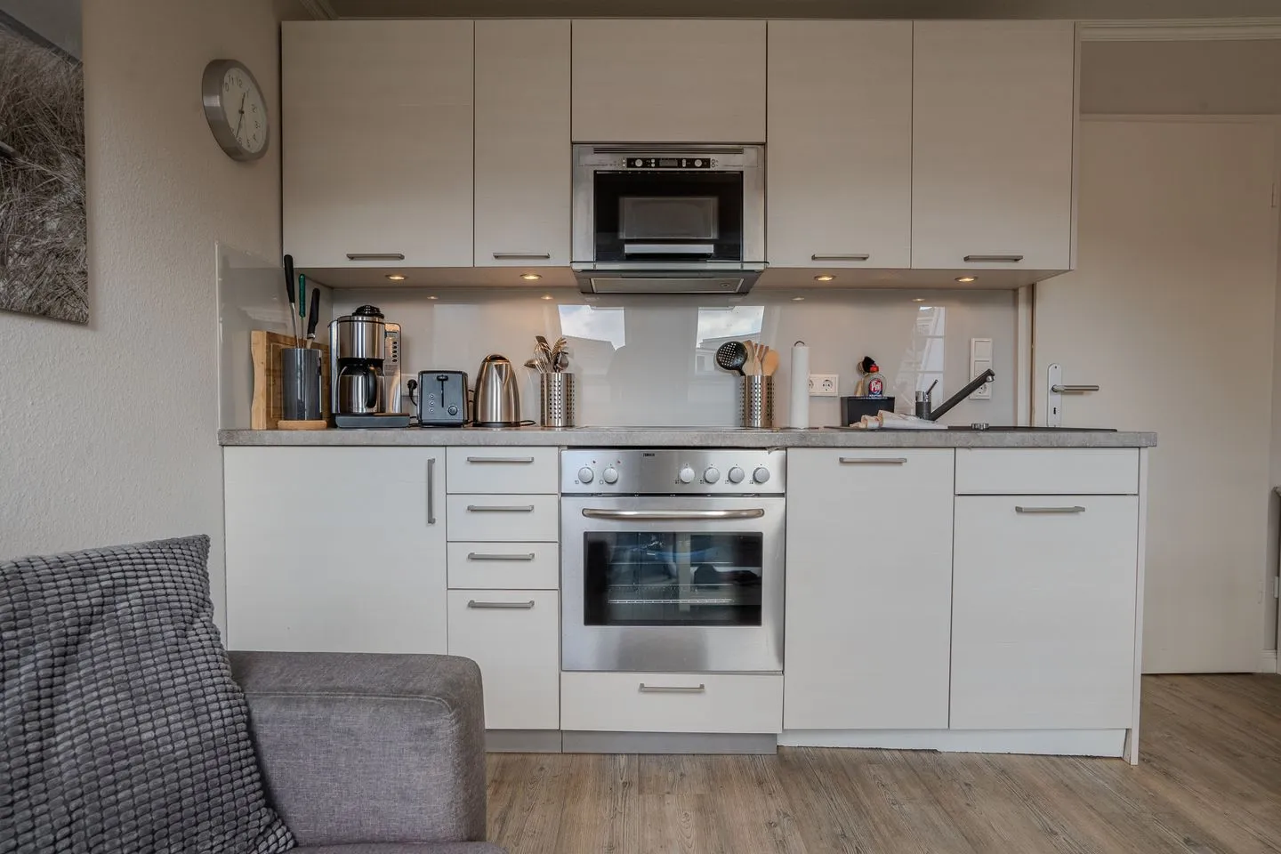 Der offene Wohn- und Essbereich verbindet den Komfort des Wohnens mit den Annehmlichkeiten einer voll ausgestatteten Küche. Diese ist mit modernen Geräten ausgestattet: Ein Ceranherd, Backofen mit Elektroanschluss, Mikrowelle, Kühlschrank mit integriertem Gefrierfach, Spülmaschine, Wasserkocher, Toaster und Kaffeemaschine erleichtern die Selbstversorgung erheblich. Außerdem finden Sie sämtliche Küchenutensilien sowie Geschirr und Besteck vor. Am Esstisch können gemeinsame Mahlzeiten in angenehmer Atmosphäre eingenommen werden.