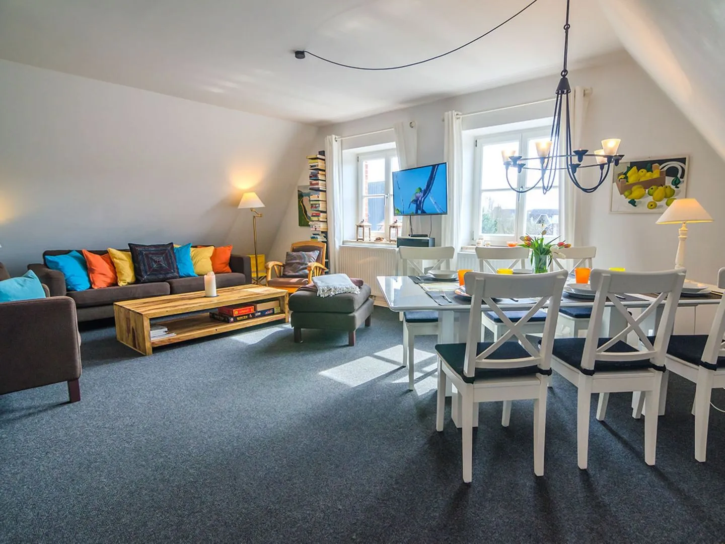 Im lichtdurchfluteten Wohnzimmer erwartet Sie eine wohnliche Sofaecke mit bequemen Sesseln, in der Sie gemeinsam entspannen können. Für Unterhaltung sorgen gleich drei Satelliten-TVs mit einer Größe von 35 bis 44 Zoll sowie ein Radio. Ein WLAN-Zugang steht zur Verfügung, damit Sie während Ihres Aufenthalts auch online bestens verbunden bleiben.