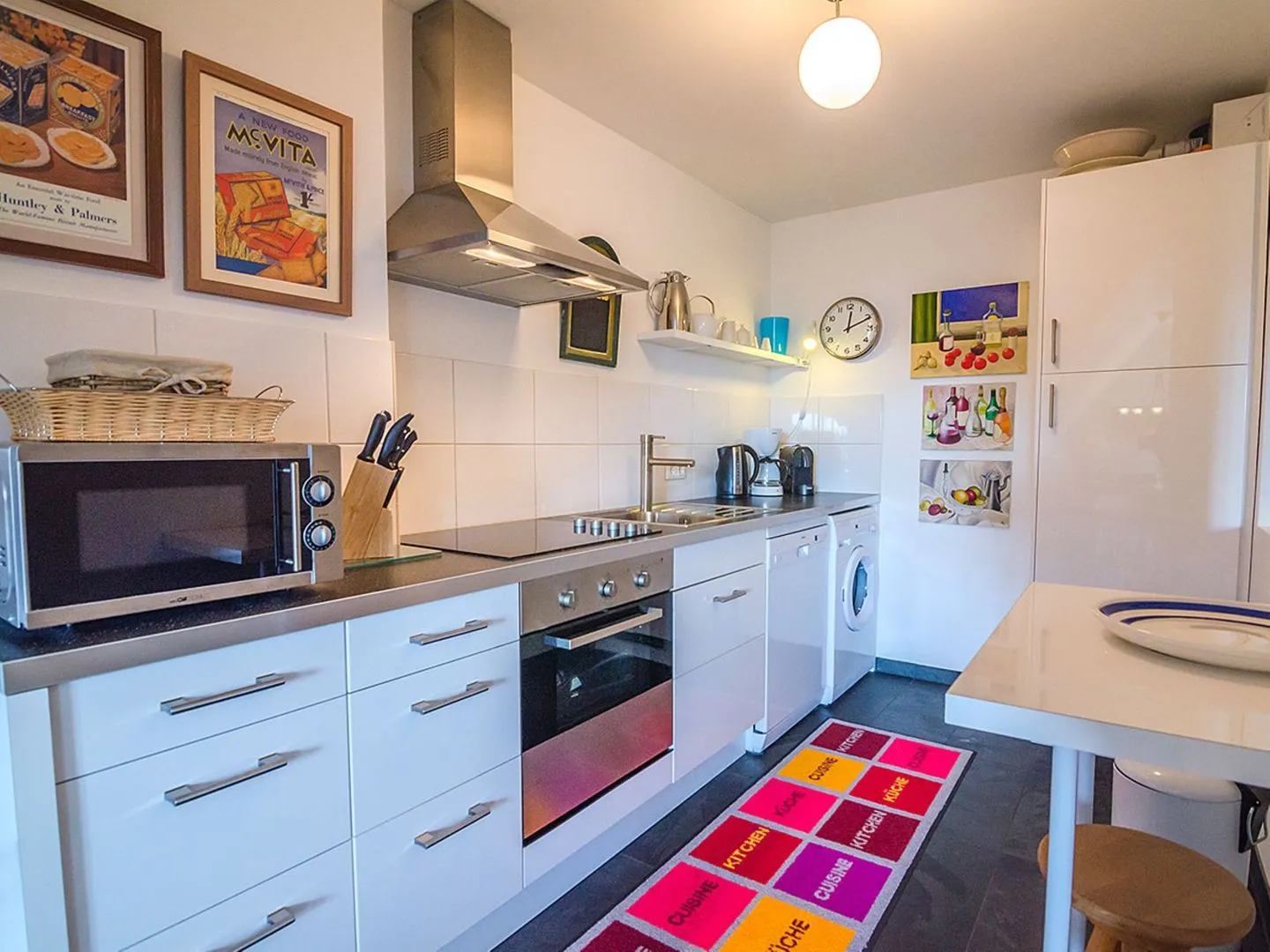 Die offen zum Wohnzimmer gestaltete Küche ist umfassend ausgestattet: Neben einem modernen Ceranherd und einem Backofen mit Elektroanschluss finden Sie eine Mikrowelle, eine Spülmaschine, einen Kühlschrank mit integriertem Gefrierfach sowie sämtliche Küchenutensilien und Geschirr. Eine Espressomaschine DeLonghi, Wasserkocher, Kaffeemaschine und ein Toaster runden das Angebot ab und sorgen für einen angenehmen Start in den Tag. Im großzügigen Essbereich mit großem Esstisch finden alle gemeinsam Platz für gesellige Mahlzeiten.