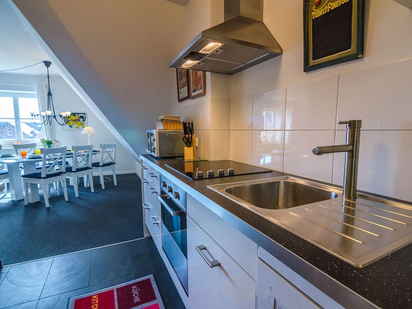 Die offene, moderne Küche ist zum Wohnzimmer hin gestaltet und lässt keine Wünsche offen. Sie ist mit einem Ceranherd, Backofen (elektrisch betrieben), Mikrowelle, Kühlschrank mit integriertem Gefrierfach, Spülmaschine, Wasserkocher, Kaffeemaschine, Espressomaschine sowie vielfältigen Küchenutensilien und ausreichend Geschirr und Besteck ausgestattet. Ein eigener Essbereich steht Ihnen zur Verfügung, sodass alle Gäste gemeinsam speisen und den Tag ausklingen lassen können.