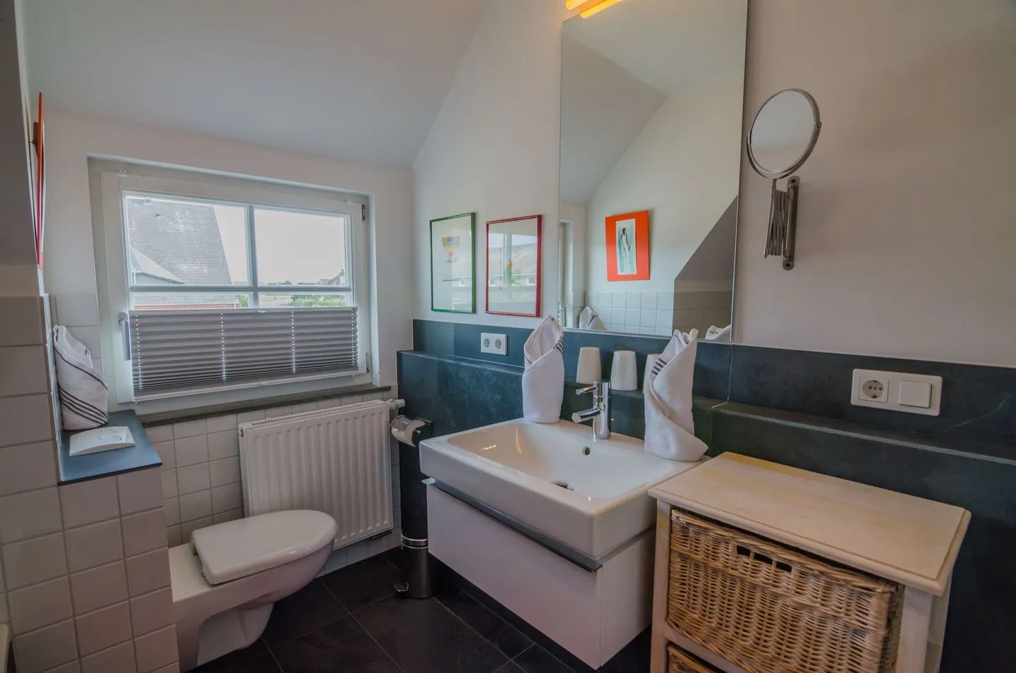 Im Badezimmer finden Sie eine moderne Dusche, eine Badewanne, Waschbecken, WC, Spiegel, sowie einen zusätzlichen Kosmetikspiegel und ein Fenster, das für Tageslicht sorgt. Ein Haartrockner ist ebenfalls vorhanden. Die Wohnung ist zudem Nichtraucher-geeignet und auf die Bedürfnisse von Familien abgestimmt – Kinder sind ausdrücklich willkommen.