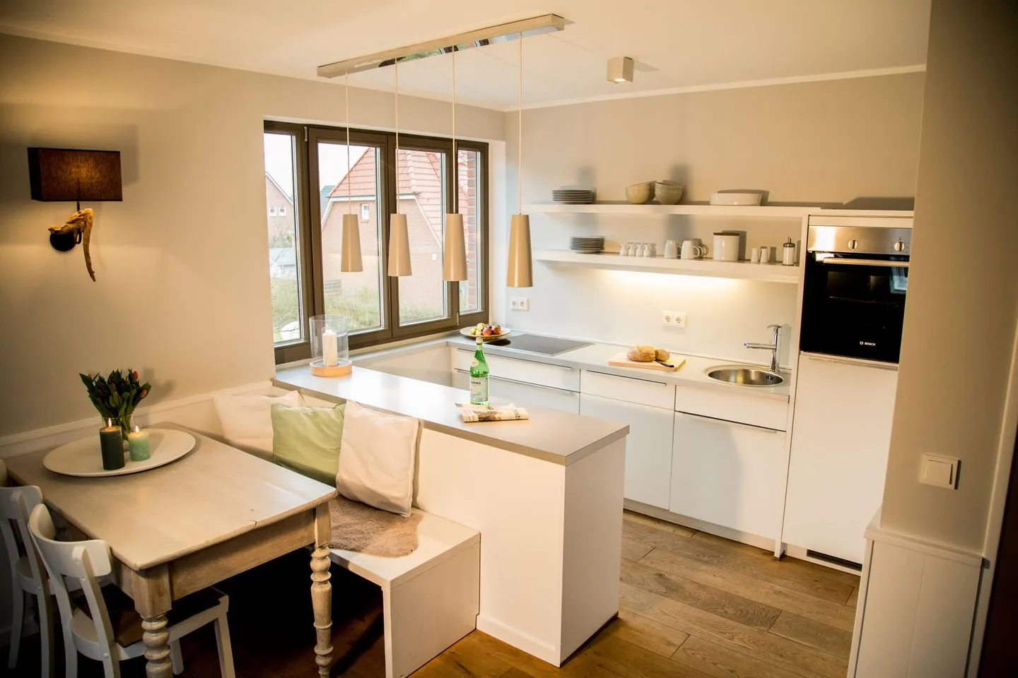Die Küche ist umfassend eingerichtet, sodass auch Selbstversorger auf nichts verzichten müssen. Neben Ceranherd, Backofen und Kühlschrank mit integriertem Gefrierfach stehen Spülmaschine, Kaffeemaschine, Wasserkocher, Toaster, Küchenutensilien, Geschirr und Besteck zur Verfügung. Ein separater Essbereich komplettiert das Raumangebot bestens für gemeinschaftliche Mahlzeiten.