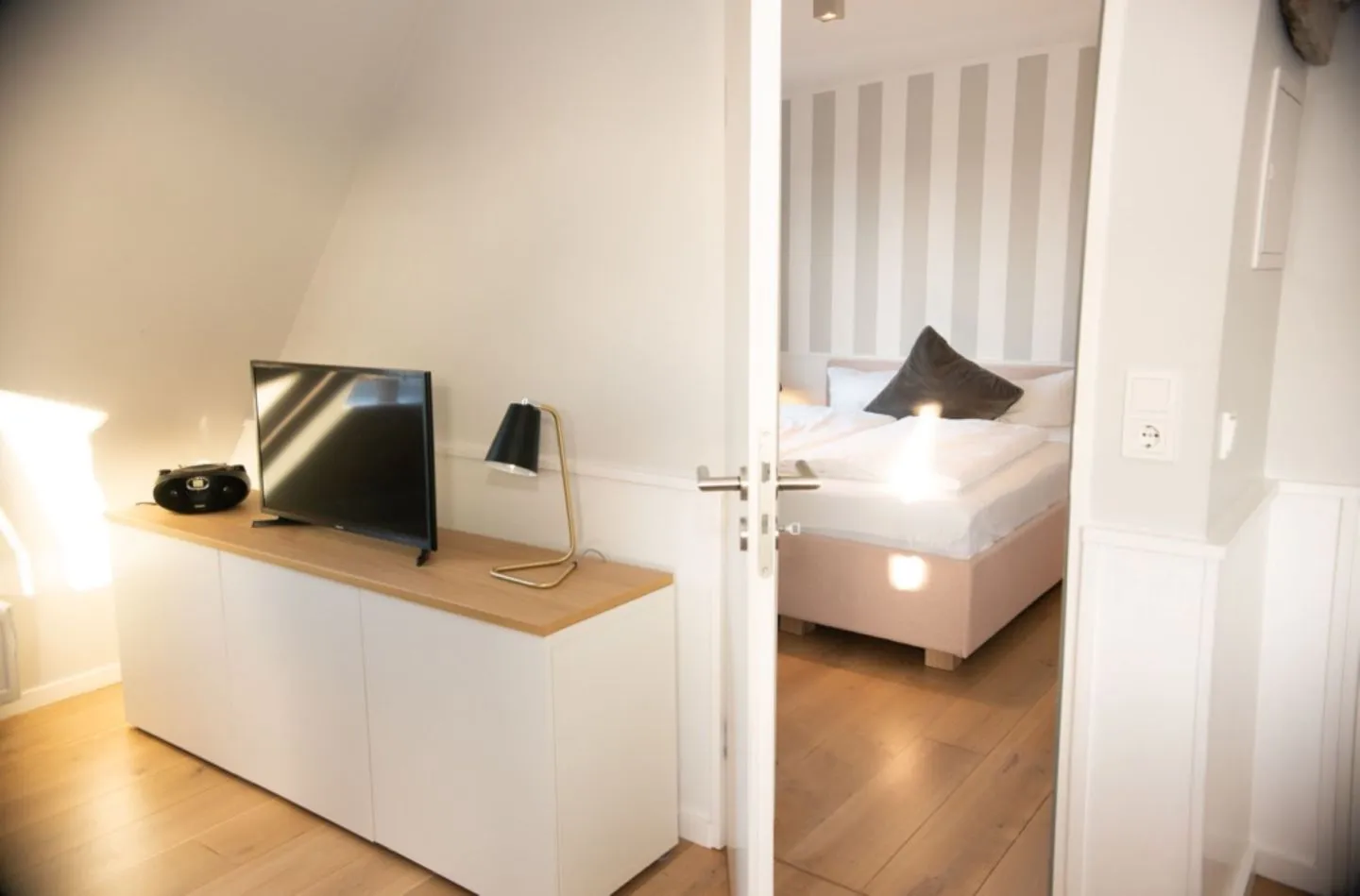 Die Ferienwohnung verfügt über insgesamt zwei Zimmer, darunter ein separates Schlafzimmer sowie einen großzügigen Wohnraum mit angrenzender, offener Küche und einem Essbereich. Auch im Wohnzimmer erwartet Sie ein freundlicher Laminatboden, der das angenehme Wohnklima unterstreicht.