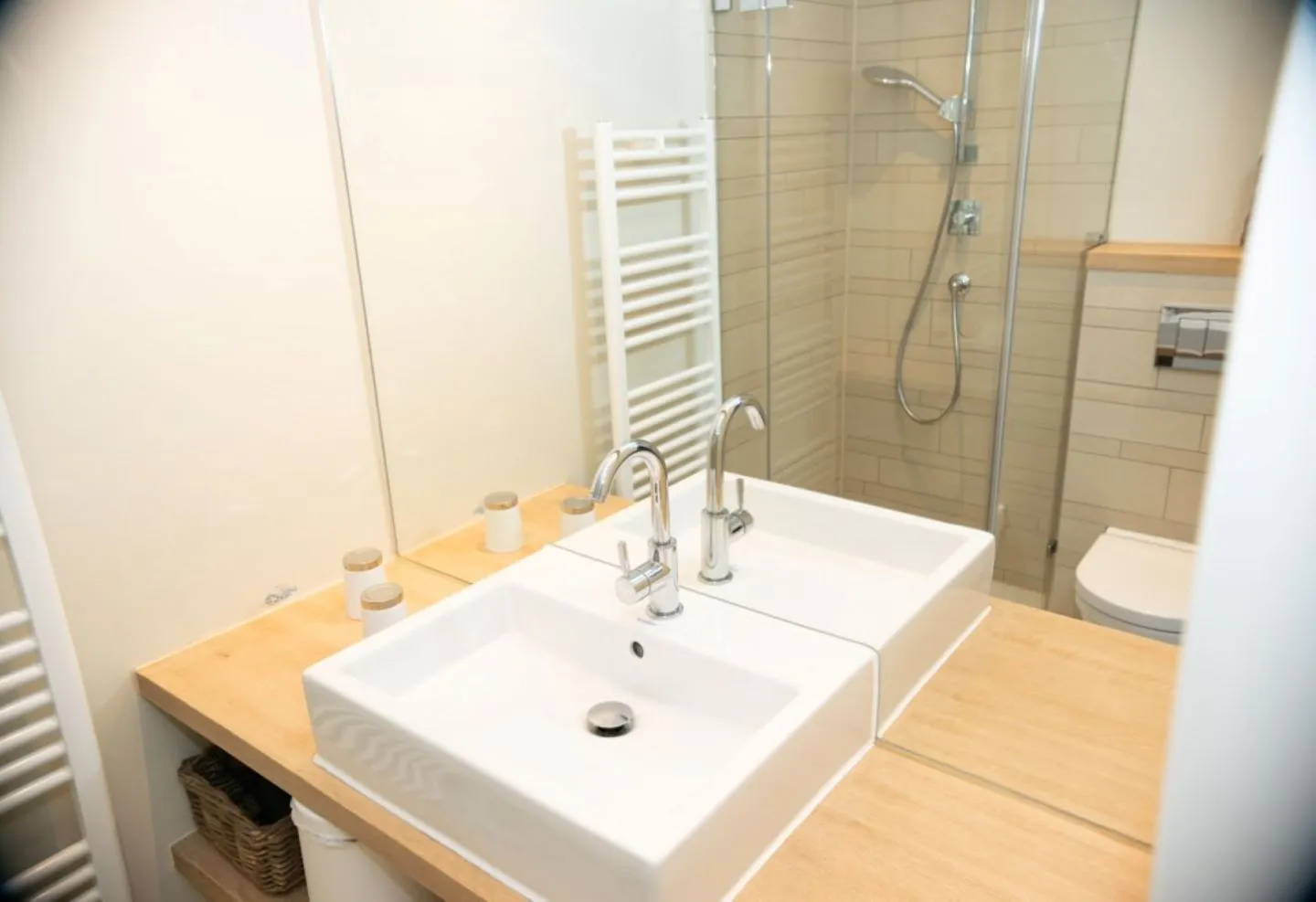 Das moderne Badezimmer ist mit Dusche, Waschbecken, WC, Spiegel und Haartrockner ausgestattet.
