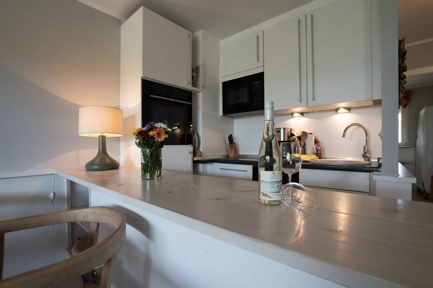 Die offene Küche ist zum Wohnzimmer hin gestaltet und mit modernen Elektrogeräten ausgestattet. Sie verfügt über einen Ceran-Herd mit Elektrobackofen, eine Mikrowelle, einen Kühlschrank inklusive Gefrierfach, eine Spülmaschine sowie alle notwendigen Küchenutensilien und Geschirr. Zur weiteren Ausstattung gehören Kaffeemaschine, Wasserkocher und Toaster. Neben der offenen Küche befindet sich der Essbereich mit einem Esstisch, der Platz für gemeinsame Mahlzeiten bietet. Das Wohnzimmer ist mit einer Sofa-Ecke sowie Laminatboden gestaltet und lädt zum Verweilen ein. Für Unterhaltung sorgen ein Fernseher mit Satellitenanschluss (Bildschirmgrößen zwischen 35 und 44 Zoll), ein DVD- und CD-Spieler sowie ein Radio. Außerdem stehen eine Auswahl an Büchern und Spielen zur Verfügung.