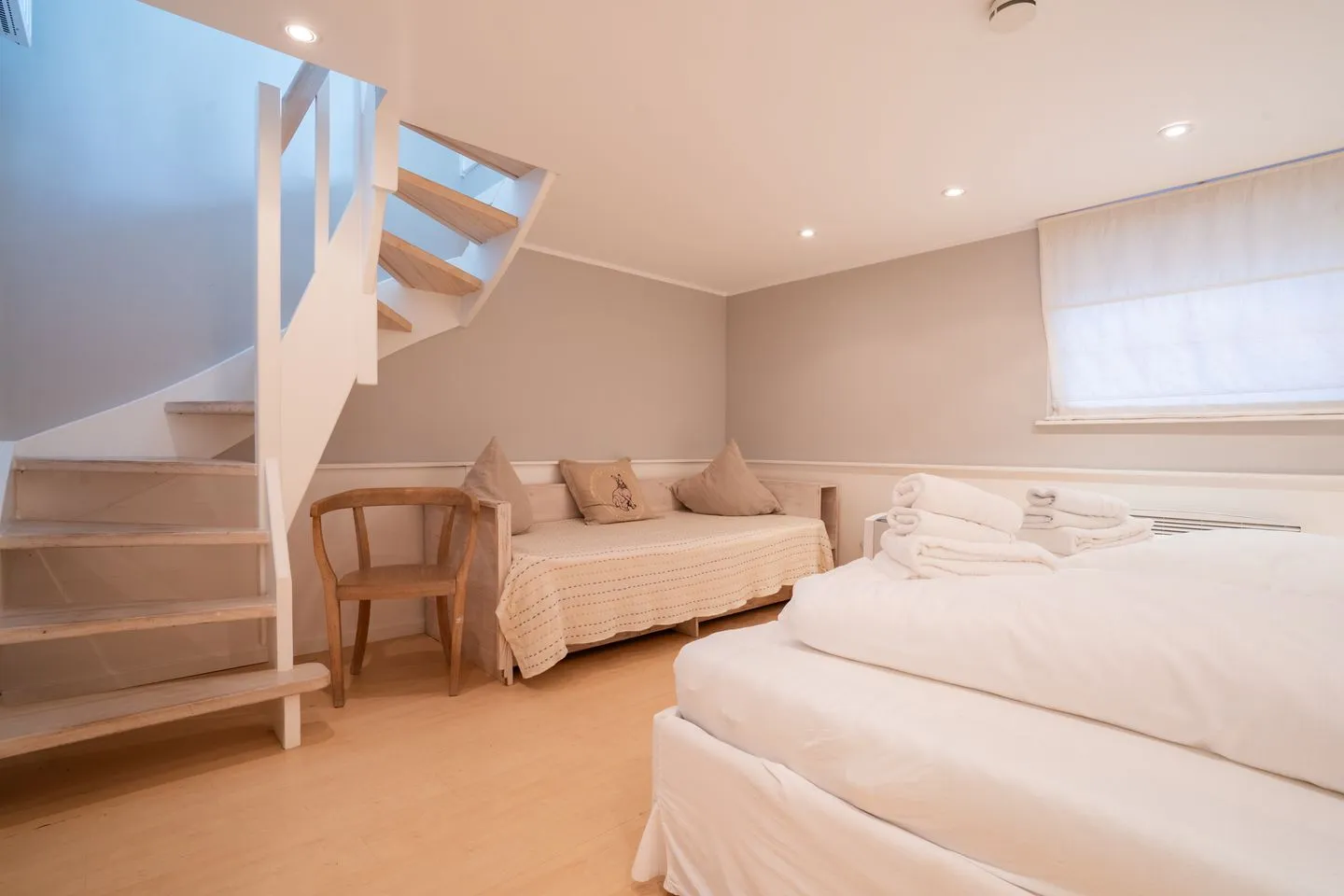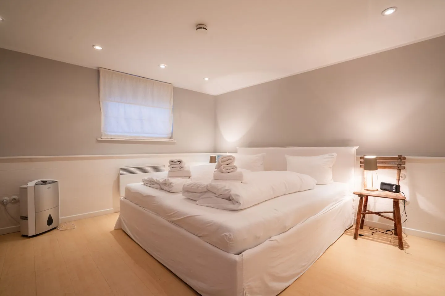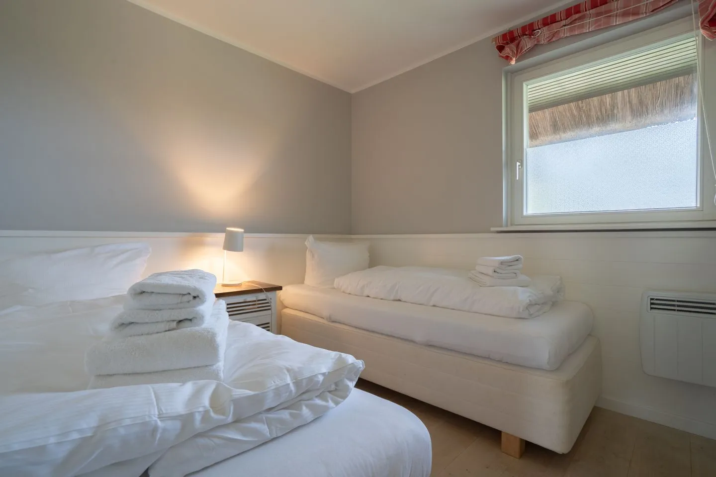 Das Ferienhaus besteht aus insgesamt drei Zimmern, darunter zwei Schlafzimmer mit Laminatboden, die ausreichend Platz für vier Schlafmöglichkeiten bieten. Die klar strukturierte Raumaufteilung umfasst ferner ein Badezimmer im EG und ein Badezimmer im UG, mit je einer Dusche, einem WC sowie einem Waschbecken. Hygienische und komfortable Details wie ein Haartrockner und ein Ganzkörperspiegel sind ebenfalls vorhanden. Zusätzlich gibt es eine separierte Garderobe, die für Ordnung sorgt.