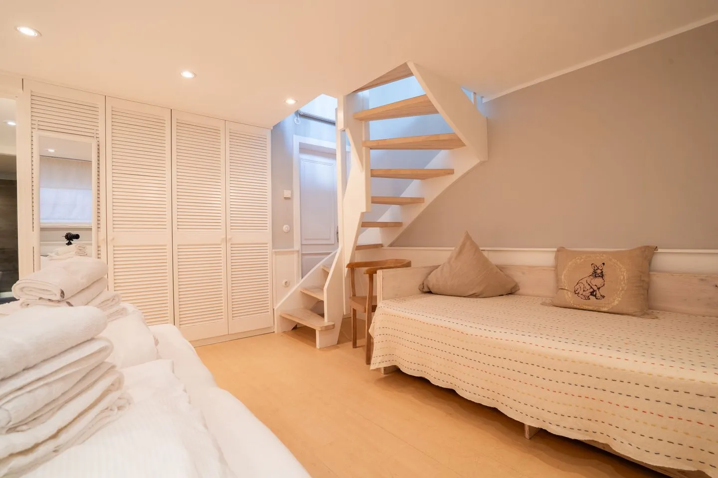 Weiterhin gehören zur Ausstattung eine Waschmaschine und ein Trockner zur gemeinschaftlichen Nutzung, sowie ein Bügeleisen und ein Wäscheständer.